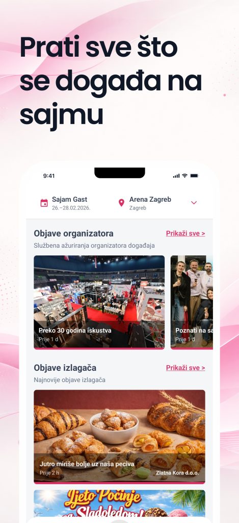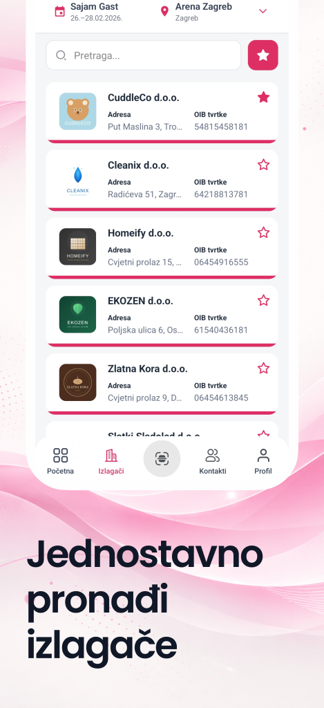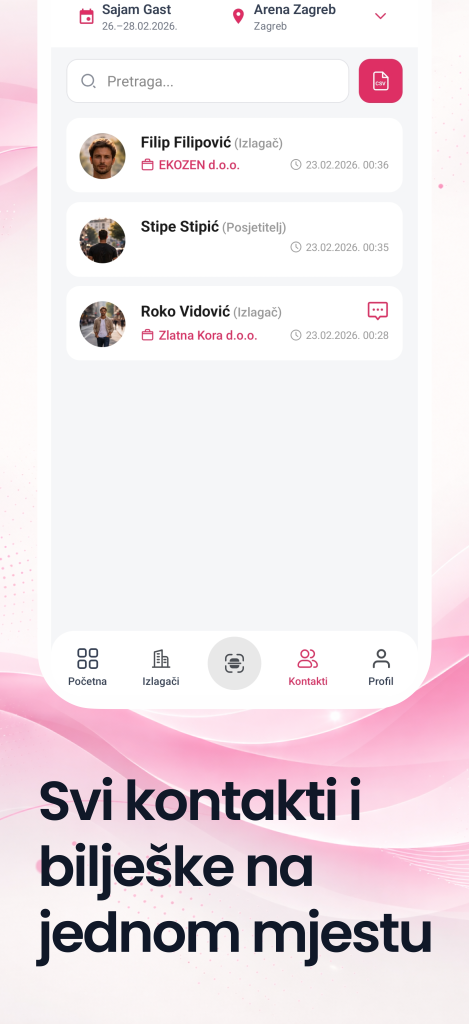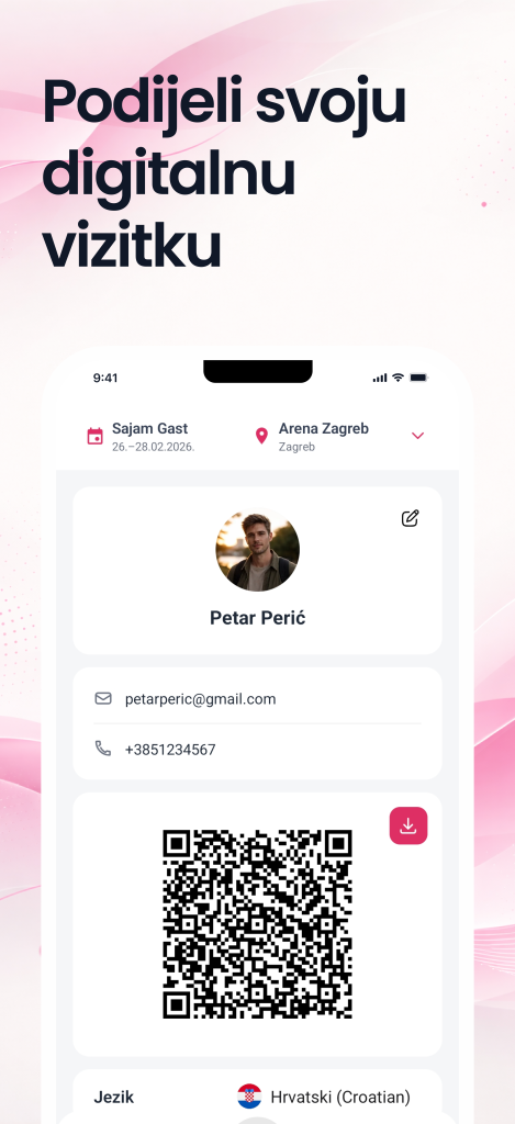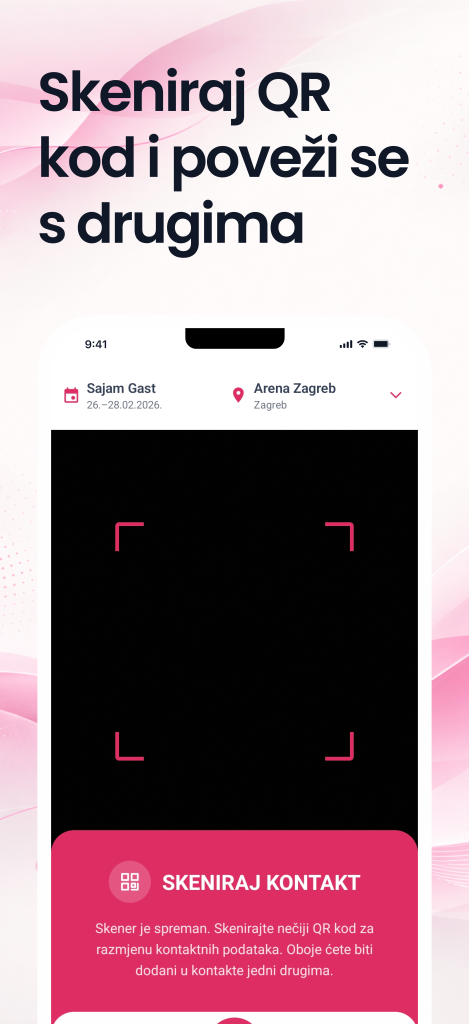 U aplikaciji možeš pratiti objave izlagača, pregledavati njihove profile i umrežavati se skeniranjem QR koda – bilo da skeniraš izlagačev ili on tvoj.